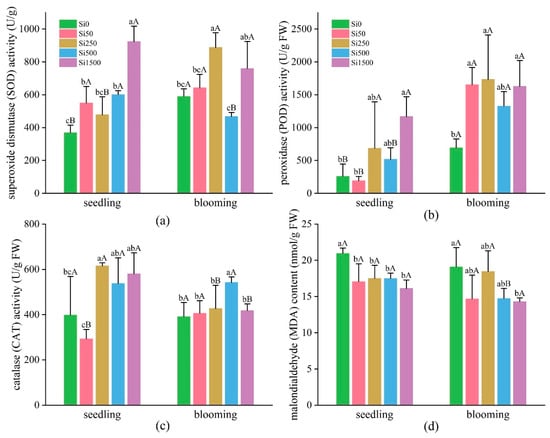 Effect of sodium silicate on antioxidant enzyme activities of sunflower at different reproductive stages. (a) Superoxide dismutase (SOD) activity, (b) peroxidase (POD) activity, (c) catalase (CAT) activity, and (d) malondialdehyde content. Small characters a, b, and c in the graphs represent significant (p < 0.05) differences between different Si levels at the same growth period; uppercase characters A and B represent significant (p < 0.05) differences between different growth periods at the same Si level.