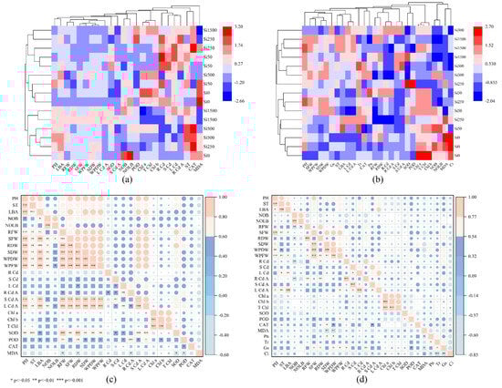 Heat map and Pearson correlation diagram of physiological and biochemical indicators of sunflower under different concentrations of sodium silicate treatment. (a) Heat map of physiological and biochemical indexes in sunflower at seedling stage, (b) heat map of physiological and biochemical indexes in sunflower at blooming stage, (c) Pearson correlation analysis of physiological and biochemical indexes in sunflower at seedling stage, (d) Pearson correlation analysis of physiological and biochemical indexes in sunflower at blooming stage. The main indicators were plant height (PH), stem thickness (ST), leaf area (LA), number of branches (NOB), number of leaf blades (NOLB), root fresh weight (RFW), aboveground fresh weight (AFW), root dry weight (RDW), aboveground dry weight (ADW), whole-plant dry weight (WPDW), whole-plant fresh weight (WPFW), root Cd content (R Cd), stem Cd content (S Cd), leaf Cd content (L Cd), root Cd accumulation (R Cd A), stem Cd accumulation (S Cd A), leaf Cd accumulation (L Cd A), chlorophyll a (Chl a), chlorophyll b (Chl b), total chlorophyll (T Chl), superoxide dismutase (SOD), peroxidase (POD), catalase (CAT), malondialdehyde (MDA), net photosynthetic rate (Pn), transpiration rate (Tr), stomatal conductance (Gs), and intercellular carbon dioxide (Ci). *, **, and *** indicate that each parameter of sunflower was significantly correlated at p ≤ 0.05, p ≤ 0.01, and p ≤ 0.001 levels, respectively.