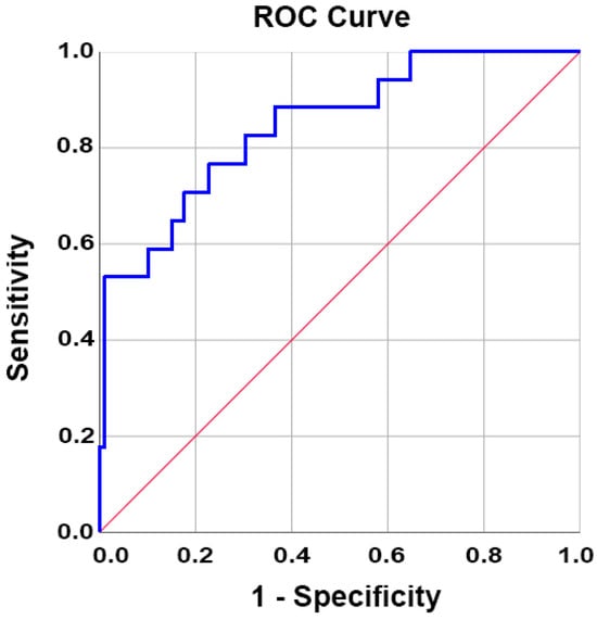 The explained variance of the model was 62.7%. The model showed adequate calibration (Chi2 = 4.409 df = 8; p = 0.818) and good discrimination (AUC = 0.845; 95% CI 0.741–0.949) (Figure 1). We found that the increase in the probability of dropping out is related to higher educational attainment. On the other hand, having a stable partner and attending childbirth preparation is associated with a longer duration of breastfeeding.