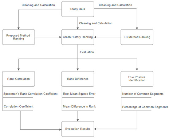Finally, the number of sites identified as critical is estimated. This evaluation listed the number and percentage of common segments between two lists: the one compiled using ranks from the proposed method and the other using ranks from observed crash data. The higher the number and percentage of the common sites, the better the performance of the proposed method because this indicates a stronger match between the prediction of the proposed method and the real-world crash data. As discussed earlier, these analyses were also performed using the EB expected number of crashes that was used for comparison purposes. The data flowchart about the methodology for evaluating the network screening performance of the proposed method is shown in Figure 3.