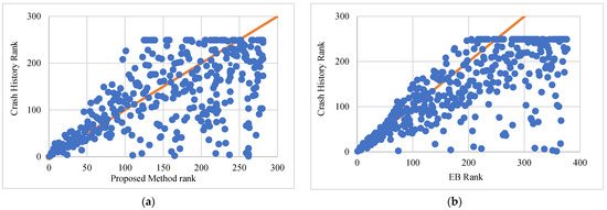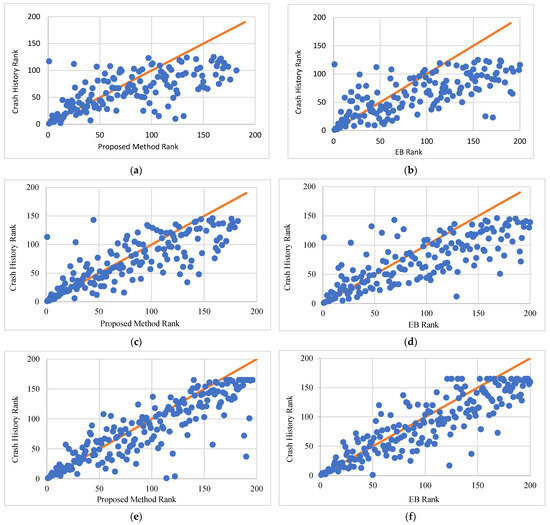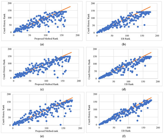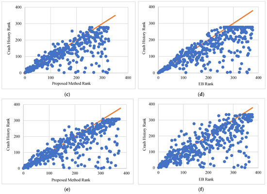 The consistency of rankings between the proposed method, the EB method, and the observed crash history is shown in Figure 7. While the data points in Figure 7a,c,e show a relatively good relationship between the rankings of crash history and the proposed method, it is not as strong as that for the crash history and EB method shown in Figure 7b,d,f. This is contradictory to the trend shown in Figure 6 for low-volume roads.