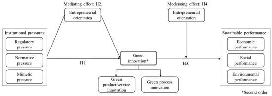 A prior study argues that as institutions pressure them to pay attention to environmental issues, they will encourage firms to adopt entrepreneurial orientations that can help them produce innovative products and achieve sustainable development. For example, Bokusheva et al. [] pointed out that to obtain green certification established by policies, laws, and regulations, many firms expand investments related to green innovation. Zhu and Geng [] stated that institutional pressures facilitate the adoption of business practices to create innovation and serve as a foundation for innovation performance. Other studies have also confirmed that institutional pressures foster green innovation by stimulating corporate environmental orientation [,]. Based on these considerations, this study assumes that entrepreneurial orientation is a potential mediator influencing the relationship between institutional pressures and green innovation. Accordingly, the following hypothesis is proposed: