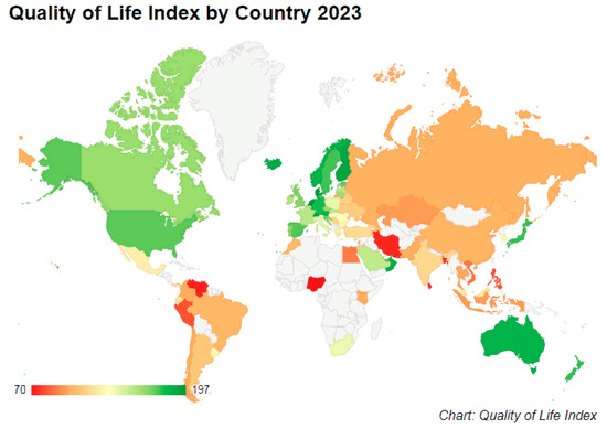 - NUMBEO. Quality of Life Index by Country 2023. Available online: https://www.numbeo.com/quality-of-life/rankings_by_country.jsp?title=2023 (accessed on 4 January 2024).