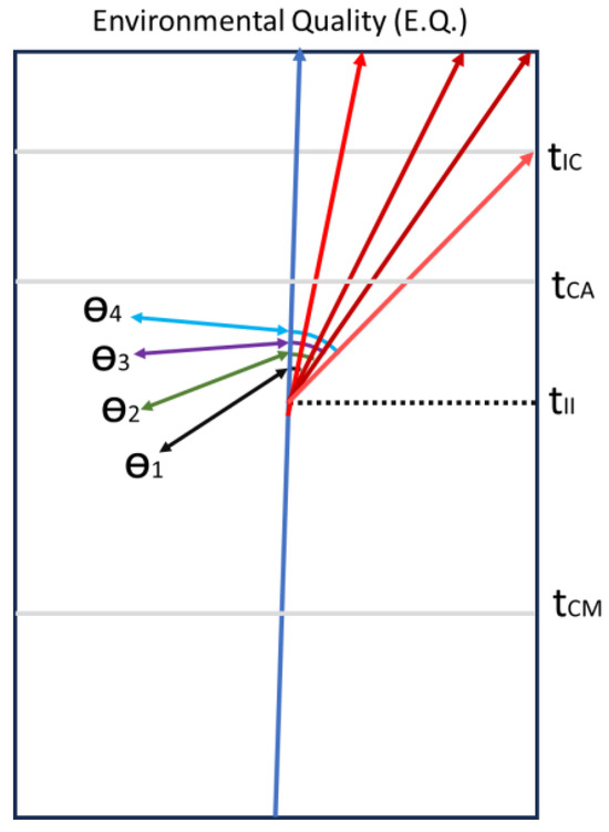 Moreover, Figure 5 shows the negative environmental impact derived from a specific action, using a distinctive red color. Four lines stand out, representing the degree of incidence of the environmental impact, with the angle formed between these lines and the line representing the evolution of the environment or of a “no action” factor being preponderant. The novelty of this approach lies in the fact that the angle formed provides a visual measure of the severity of the environmental damage, establishing a direct relationship between the extent of the angle and the magnitude of the adverse impact. Thus, the greater the angle, the greater the degree to which the environment is affected, allowing for an intuitive interpretation of the severity of the negative environmental impact of the action under consideration. In this way, a direct relationship can be given between the magnitude of the angle and its incidence in terms of impact; thus, angle 4 will be categorized as total impact, angles 3 and 2 as medium and notable, respectively, and finally, 1 as minimal impact.