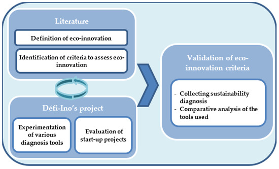 The research methodology presented in this paper is based on action research principles as defined by Reason and Bradbury [28]. It needs to focus on solving very specific problems, and involves stakeholders in a collaborative, participatory, and iterative process. For these reasons, the research method has been conducted to ensure close collaboration with two French Institutes of Technology (FITs): one is working on solar energy and the other on microelectronics. The FITs play a significant role in fostering entrepreneurship in France by supporting entrepreneurs and innovative companies in various fields such as energy, micro-electronics, and information technology. The FITs operate several technology transfer and incubation programs, as well as providing funding and resources to start-ups and small businesses to help them commercialize new technologies and bring them to market. Indeed, collaborative networks with research institutes, agencies, and universities are essential to drive all types of eco-innovation [29]. Therefore, the FITs work with other organizations, such as business incubators, venture capital firms, and universities, to support the development of innovative technologies. The FITs select innovative start-up proposals through a rigorous process that includes initial screening, technical and business evaluations, and funding decisions. The proposals that pass the initial screening are then evaluated by a group of experts based on the technical feasibility, as well as for the business plan, the team, and the market potential. Based on these evaluations, the FITs decide which proposals to fund and support. Increasingly, the FITs need to consider the environmental and social impacts of the proposed technology or business idea, as well as its potential to contribute to the reduction in greenhouse gas emissions or the promotion of use of renewable energy sources. The objective of the action research presented in this paper is to understand the needs and concerns of the two FITs about the assessment of innovation sustainability, to develop context-specific solutions, and to continuously adjust the research process. The framework of this study is called the “Défi-Ino” project, which stands for “the challenge of innovation” within the eco-innovation context. “Défi-Ino” is a qualitative and collaborative research approach that involves a group of researchers from a French RTO (Research and Technology Organization) focusing on alternative energies, researchers from a laboratory working on eco-design and sustainability, and two consulting companies who are experts in sustainable development topics. The main goal of Défi-Ino is to propose and compare a set of eco-innovation methods allowing the two FITs to conduct a quick sustainability diagnosis in the initial screening process (this should last less than 1 day and cost less than 1.000 €). The reason for keeping a variety of testing approaches is that the consultants who will conduct the audits may not have been involved in the study.