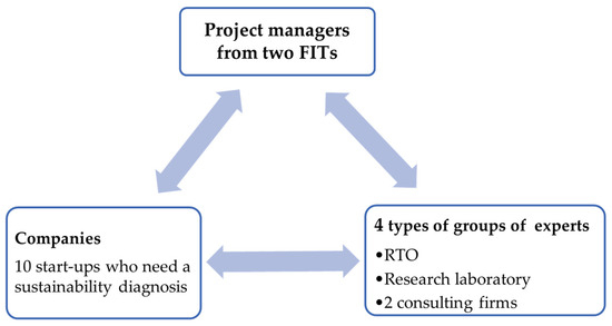 The Défi-Ino project involved various stakeholders as illustrated in Figure 2. It was led by a group of project managers from two FITs. Four experts were requested to carry out a sustainability diagnosis, with the idea of deploying different methods and expertise for assessing eco-innovation, to be able to involve different consultants in the future. The FITs project managers selected these experts among their network of experts, based on their recognized expertise in sustainability assessments and their innovative approaches to eco-innovation diagnostics. The selection aimed to encompass a broad range of perspectives and methodologies, ensuring a comprehensive and multi-dimensional analysis of the eco-innovations under study. The experts’ methodologies were selected for their complementariness in covering different aspects of sustainability, from environmental impacts to social implications and alignment with circular economy principles. Also, as this is an experimental project for the two FITs, tools that could be effectively applied in the early stages of innovation were prioritized to ensure relevance to the start-ups involved in the project. The preference was for tools that could be used when detailed information is limited.