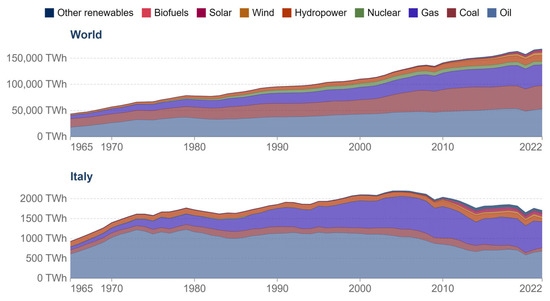 21], revealing the constant growth in energy production from solar and wind systems and the significant decline in hydroelectric energy production since 2020. The transition towards the implementation of renewable energy plants, the promotion of energy efficiency policies, especially in the construction sector, as well as the reduction of dependence on Russian natural gas imports, thanks to the acquisition of alternative suppliers (gas pipelines and LNG infrastructure), are in line with Italy’s climate objectives.