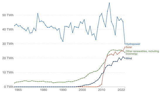 Figure 3 shows the trend in renewable energy generation by source in Italy, between 1965 and 2022 [