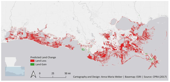 All in all, these various processes have resulted in high amounts of land loss on the southern Louisiana coast. For example, the relative sea level rise in the Gulf of Mexico resulted in an annual land loss on the southern coastal area of Louisiana of approximately 77 km2 (30 mi2) in the years between 1978 and 2000 alone [1]. In total, sea levels at the northern coast of the Gulf of Mexico are projected to rise from 0.34 cm to 1.9 m by the end of this century relative to that of the beginning of the twenty-first century [139,144]. These projections would entail a further loss of coastal land until the end of the century between 2188.97 km2 and up to 5875.27 km2 (which equals between 9% and up to 24% of the wetland area calculated in 2007; [144,145]). Resulting from the processes of coastal land loss, the Coastal Protection and Restoration Authority of Louisiana is expecting annual damages between USD 15.2 billion up to USD 24.3 billion as well as annual structural damages between 14,000 and 22,000 structure equivalents within the next 50 years without protective and restorative measures [146]. Figure 1 shows that, according to a 2017 projection by the Coastal Protection and Restoration Authority of Louisiana (CPRA), even more areas of Louisiana’s coastal region are projected to disappear within the next 50 years [147,148].