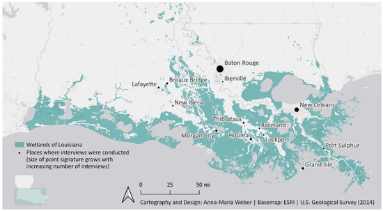 The map shows the locations where the guided interviews and ero-epic interviews were conducted. All locations were within the coastal region of Louisiana and close to the wetlands (own representation based on [171,172]).