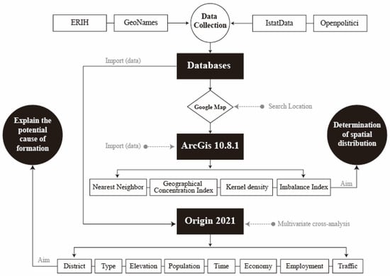 This study focuses on analyzing the distribution patterns and formation factors of industrial heritage in Italy, aiming to delve into the scientific and scholarly aspects of this field. First, we utilized the ERIH database to obtain detailed distribution data for industrial heritage sites in Italy, thereby establishing a comprehensive and systematic foundational database. Subsequently, specific latitude and longitude coordinates for 120 Italian industrial heritage sites were acquired using Google Maps and subjected to coordinate adjustments to ensure data accuracy and reliability. Following this, we imported these data into the ArcGIS 10.8.1 platform and employed various technical methods such as nearest neighbor analysis, kernel density analysis, imbalance indices, and geographic concentration indices to conduct in-depth research on the spatial distribution patterns of Italian industrial heritage and its influencing factors. Specifically, methods including nearest neighbor indices and kernel density analysis were employed to detect the spatial evolution of Italian industrial heritage distribution [33]. Additionally, a combination of techniques, including kernel density analysis, nearest neighbor analysis, and imbalance indices analysis, was used to explore the spatial distribution balance and types of traditional villages [33,34]. Furthermore, we utilized Origin software version 2021 to perform cross-analysis on multidimensional data, including Italy’s economic indicators, employment rates, and elevations, aiming to provide a more comprehensive explanation of the distribution characteristics of Italian industrial heritage and to answer RQ1. The research framework is illustrated in Figure 1.