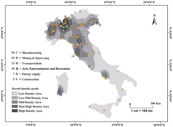 By statistically analyzing the historical production activities of Italian industrial heritage sites and categorizing them according to ISIC standards, along with color differentiation in the kernel density map (Figure 2), we identified 56 sites in the manufacturing sector (Class C), 29 in mining and quarrying (Class B), 5 in construction (Class F), 13 in transportation (Class H), 7 in energy supply (Class D), and 10 in educational activities (Class R) within Italian industrial heritage. It is evident that the manufacturing sector comprises the largest proportion of industrial heritage sites, mainly concentrated in the northern regions. Mining and quarrying are concentrated in the northeast region and Sardinia. Other industry types exhibit less distinct characteristics and are relatively dispersed.