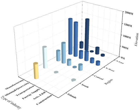 The regional location and elevation exert a considerable influence on the distribution of industrial heritage sites in Italy. Italy is in the southern region of Europe, with a total area of 301,333 square kilometers [52]. Italy shares borders with France, Switzerland, Austria, and Slovenia to the north [53]. The Adriatic Sea, Ionian Sea, and Tyrrhenian Sea form its eastern, western, and southern boundaries, respectively, giving Italy a coastline that stretches over 7200 km. The country consists of 35% mountainous terrain, 41% hilly regions, and only 23% plains. Mount Cervino is the tallest summit, reaching an elevation of 4810 m [54]. Geographical considerations, including solar exposure, soil quality, and climate, have a significant impact on the choice of industrial sites [55]. This has led to differences in production methods at different site locations and, in turn, influenced the regional distribution of industrial heritage and types of production. Out of the 120 discovered sites, the northwestern area has the largest number of sites, specifically 47, which make up 39.17% of the overall number of sites in the country. The northeastern region comprises 29 sites, accounting for 24.17% of the total. Meanwhile, the central region contains 26 sites, representing 21.67%. The southern regions and islands have the lowest number of sites, with each area having a total of 9 sites, accounting for 7.50% of the total countrywide. By examining the cross-analysis in Figure 3, it becomes clear that the northern sites make up 65% of Italy’s total sites. This is almost 8.67 times greater than the number of sites in the south or on the islands. An analysis of the height distribution reveals that 88.3% of industrial historical sites are situated below 600 m, while 5.8% are found between 600 and 1000 m, and 5% are placed above 1000 m. Out of the 120 sites, manufacturing is the most prevalent production category, with 56 sites, representing 46.67%. The breakdown of the number of sites in different industries is as follows: mining has 29 sites, accounting for 24.17%; transportation has 13 sites, representing 10.83%; art, entertainment, and leisure have 10 sites, making up 8.33%; energy supply has 7 sites, contributing to 5.83%; and construction has the lowest number of sites, with 5, representing 4.16%.