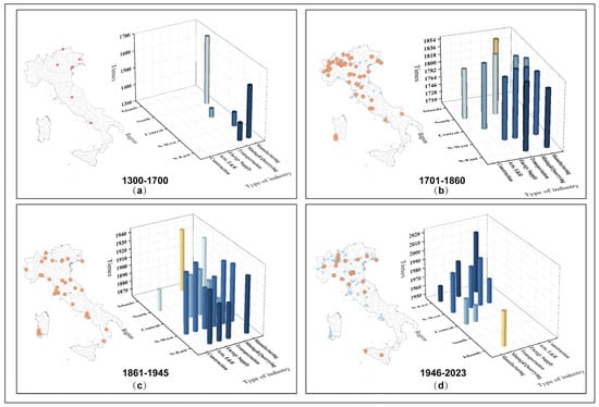 Historical events closely intertwine with the distribution and building of industrial heritage sites in Italy. The inventory traces back industrial heritage remnants to the year 1310. The Italian Renaissance began in the 14th century, during which towns such as Florence, Venice, and Milan gained independence as separate political entities [63]. These cities experienced great progress in both economic and cultural aspects because of the city-state system and economic development [64]. Trade thrived between these city-states both internally and externally, leading Venice and Florence to emerge as Italy’s primary centers for trade and finance throughout that period. During the 14th to the late 16th centuries, the Renaissance period saw a significant increase in interest in humanistic ideas, emphasizing the value of human beings and showing a strong fascination with Greek and Roman art and learning. This period witnessed the embracing of aesthetic values in products, the questioning of traditional ideas, and the emergence of notable scientific breakthroughs and inventions [65]. Throughout this era, industrial production consistently sought innovative manufacturing methods, prioritizing the integration of product functioning with artistic aesthetics and placing great importance on the aesthetic worth of the products. Italy’s industrial growth commenced in the 18th century, marked by gradual progress mostly focused on agriculture and craftsmanship. However, this phase established a strong foundation for Italy’s subsequent industrial revolution. Subsequently, throughout the late 18th and early 19th centuries, Italy experienced the initiation of its industrial revolution, which occurred comparatively later in comparison to other European nations. Metropolitan areas like Milan, Turin, Genoa, and Naples experienced a rise in industrialization, leading to a substantial enhancement of traditional handicraft through mechanized industrial production. The proclamation of the Kingdom of Italy in March 1861 heralded a period of political and economic unification, which, in turn, spurred advancements in markets, infrastructure, technology, policies, and other areas of growth [66]. The two World Wars of the 20th century catalyzed economic progress and technological innovations, although they also inflicted significant devastation and casualties. Italy effectively revitalized and expanded its industries through post-war reconstruction and economic reforms, establishing the groundwork for national economic affluence. After World War II, Italy held a statewide referendum that resulted in the abolition of the monarchy. This decision created a more stable political and economic environment, which, in turn, facilitated industrial modernization and led to additional advancements in industrial output [67]. Currently, Italy has established itself as a globally recognized manufacturing leader, demonstrating exceptional expertise in specialized and cutting-edge industrial production skills.