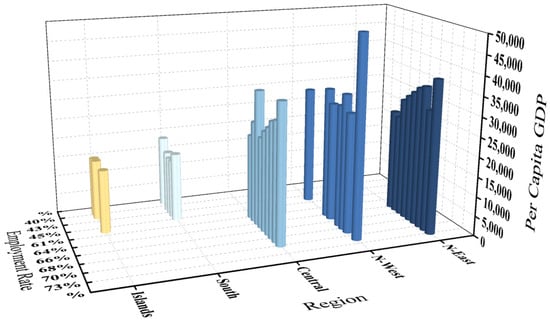The spatial distribution of industrial sites is closely linked to socio-economic development. Generally, regions with strong economies usually have stable social conditions and provide substantial economic assistance for industrial manufacturing [68]. The northern regions of Italy, which encompass 40% of the country’s land area and are home to approximately 46% of the population, account for 59.4% of the GDP. Lombardia has a GDP of approximately 35,400 euros, which is 22% greater than the national average. This accounts for nearly 20% of the country’s total GDP. Conversely, the economic progress in the southern areas of Italy is falling behind, exhibiting growth rates that are lower than the national average. These regions account for only 63% of the per capita GDP, as depicted in Figure 5. The northwest, northeast, and central regions not only possess a larger quantity of industrial historic assets but also demonstrate higher per capita GDP and employment rates. Out of all the regions, the northeast area has the greatest average employment rate, standing at 68.63%, and a comparatively high per capita GDP of 29,867.3 euros. The manufacturing industry in this region makes a substantial contribution to economic growth. In 2019, Bolzano in the northeastern area of the country had the highest employment rate nationwide, reaching 72.9%. Gorizia, in the same vein, registered a 63.9% employment rate and a per capita GDP of 23,162 euros. Although it is the lowest in the northeast region, it nevertheless exceeds the highest levels found in the southern regions and islands. The varied industrial production structure in Milan’s northwest area has resulted in the highest employment rate and per capita GDP, contributing to its socio-economic development. The proliferation of industrial production has generated a multitude of job prospects, therefore, driving economic expansion. Florence, located in the central area, boasts a remarkable employment rate of 70.3% and a substantial per capita GDP. In regions with few industrial heritage sites, such as the southern regions and islands, the average employment rate in the southern region is 40.94%, while the islands have an average employment rate of 48.74%. Both rates are lower than the national average of 62.465%. In today’s economy, the southern areas depend significantly on conventional industries that have a relatively limited ability to create employment opportunities. These industries exhibit limited employment flexibility, resulting in a migration of the younger population towards the north in pursuit of work prospects [69]. This migration has had a substantial impact on employment rates in the southern regions. Hence, there is a clear association between the economic imbalance between the north and south regions and the distribution of industrial heritage sites. The northern regions demonstrate more significant economic advancement, characterized by greater per capita GDP and employment rates, which align with the distribution of industrial legacy. Urban areas with a significant number of job opportunities contribute to a strong workforce, leading to an increase in per capita gross domestic product (GDP) and promoting economic growth in cities. This development stimulates increased investments and industrial inputs, hence, fueling the expansion of urban industrial levels and size. Additionally, regional economic development has a role in both preserving and investing in industrial legacy. The administration of heritage resources plays a crucial role in fostering and advancing regional economic growth [70]. Tourist services in the tourism industry include heritage sites [71]. These cultural legacies have a positive impact on the tourist and cultural sectors, providing increased job prospects for nearby towns and, hence, stimulating local economies [72]. Over time, stakeholders have established specific itineraries for industrial tourism that involve visiting places of industrial heritage, industrial technology centers, museums, and other related locations. These initiatives aim to foster sustainable growth within the realm of cultural tourism. This component has garnered significant attention in recent years with regards to industrial heritage tourism [71,73,74,75,76].