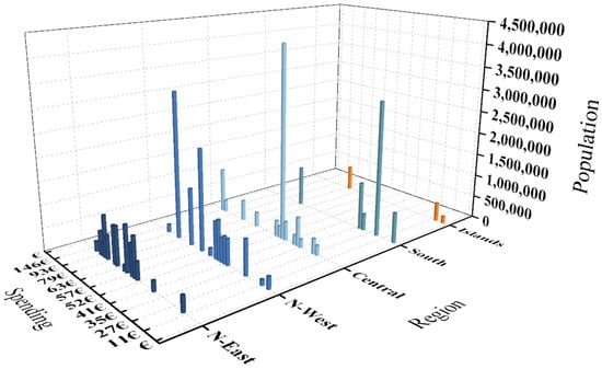 The preservation and management of industrial heritage sites, whether in urban or national contexts, greatly rely on the impetus and support provided by national policies [77]. Enacting policies enables the conservation of historical values associated with industrial heritage, thereby promoting sustainable development. Italy boasts the largest number of cultural heritage sites worldwide, with China closely following in second place. The nation’s policy for conservation and utilization is a systematic approach that incorporates robust legal frameworks, rigorous management systems, and significant public engagement. Italy’s legislation has shown a notable focus on cultural heritage, as indicated by the inclusion of 48 laws and regulations related to cultural heritage in the UNESCO database of cultural heritage laws spanning from 1820 to 2016. Law No. 42 of 2004, also referred to as the “Code of Cultural Heritage and Landscape”, introduces a broad range of safeguards for cultural heritage and natural surroundings. It provides accurate legal counsel and regulations for protecting sites. According to Article 30(4), local authorities have the obligation to safeguard and create inventories of cultural assets within their jurisdiction. Article 169(1)(a) enforces criminal penalties for activities that damage, modify, or restore or alter legally protected culturally significant properties without authorization. These mandatory policy regulations ensure the preservation and protection of the wealth and quality of heritage [78]. At the administrative level, the Italian government has established specific agencies and departments that focus on protection, such as the Ministry of Cultural Assets and Tourism (Ministero dei Beni e delle Attività Culturali e del Turismo) and regional offices that are responsible for cultural assets. These entities are responsible for the advancement, management, and supervision of industrial heritage. Local governments also have independent cultural heritage preservation entities that are responsible for promoting and advocating for local cultural treasures. This comprehensive management strategy ensures the preservation of heritage sites. Experts in heritage conservation and affiliated organizations established the Industrial Archaeology Heritage Association (AIPAI) in 1997. Its purpose is to supervise the administration of industrial heritage. This association collaborates with universities, research institutes, institutions, museums, and central and local state institutions to promote, coordinate, and conduct research projects. The main objective is to analyze the industrial archaeological legacy within cultural and environmental heritage frameworks while also supervising, protecting, and advocating for initiatives associated with Italian industrial heritage. The Italian government has enacted various measures to foster public involvement regarding cultural heritage. These measures encompass strategies to enhance public education on cultural heritage, broaden opportunities for public engagement in heritage preservation, and emphasize the formation of civic organizations focused on heritage preservation [78]. Both private and public projects can undertake deliberate endeavors to preserve cultural heritage, as stated in Article 111 of the “Code of Cultural Heritage and Landscape”. The purpose of these measures is to foster inclusivity among participants and guarantee equitable treatment. Article 118(1) recommends that government organizations actively encourage and streamline research on cultural heritage at universities and other public and private institutions [79]. Article 120(1) permits private organizations to financially assist endeavors aimed at protecting the national cultural heritage. Since 1996, Italy has implemented a decree mandating the allocation of 0.8% of the proceeds derived from various lottery tickets within society to a specific fund with the purpose of protecting the country’s cultural legacy. Governments allocate specific funds from local budgets to invest in and provide support for the preservation of historical artifacts, in addition to meeting legal obligations. Municipal governments spend an average amount of money per person on improving and safeguarding cultural assets, as shown in Figure 6. The data are organized based on the population sizes of different regions. Florence, situated in the Central Region, dedicates the highest proportion of funds among the 120 Italian cities indicated for the preservation of cultural assets. More precisely, the city allocates a budget of 145.96 euros per capita. Siena, also located in the central area, ranks second with a per capita expenditure of 138.65 euros. Trieste, located in the northeast area, allocates a budget of 121.33 euros per inhabitant. Cosenza in the southern region and Enna in the islands have the smallest amount of money spent per person out of the 120 officially recognized heritage sites, with the municipality spending only 8 euros per person in these cities. Bergamo and Verbano-Cusio-Ossola, located in the northeast area, have costs of 8.81 euros and 9.12 euros, respectively, both below the 10-euro threshold. The north and central regions, known for their abundance of heritage assets and larger population, require additional financial resources to effectively manage and maintain these sites. Policy assistance is crucial for safeguarding industrial heritage assets. It ensures the methodical surveillance and preservation of the quantity and caliber of industrial heritage. Through the provision of legal guidance and the enforcement of legislation, it restricts and diminishes public activities that have the potential to cause harm or encroach upon safeguarded locations, thereby safeguarding their integrity and genuineness. Without these supportive policies, the number of heritage sites may decline, which would significantly affect the conservation of and research into industria