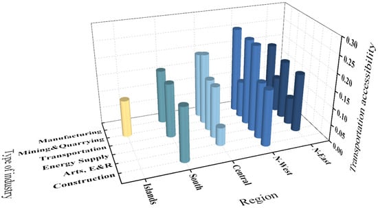 Cross-analysis plot of regions, types, and accessibility of heritage sites. The colors represent the five regions in which the Italian industrial heritage sites are located, and the higher the bar, the more accessible the site is.