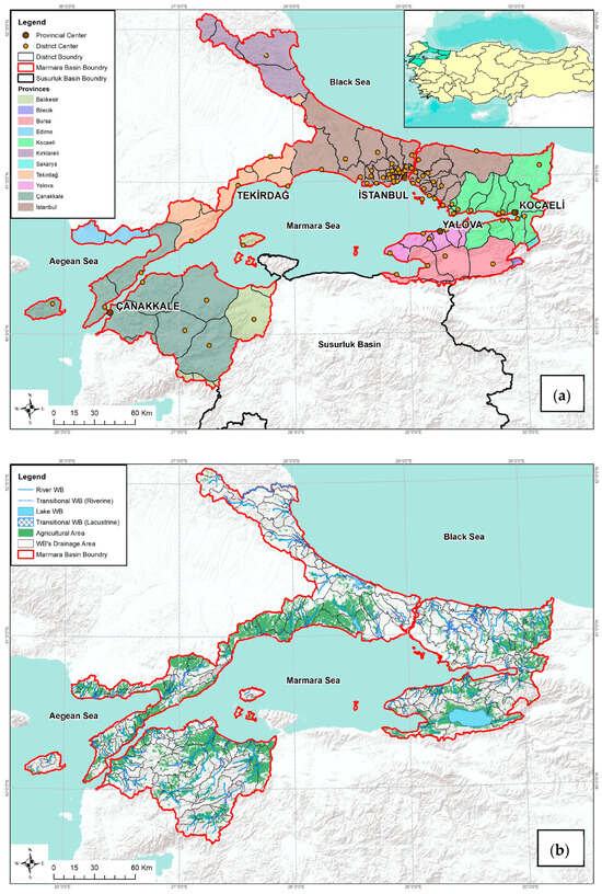 The Marmara Basin, located in the Northwest of Türkiye, covers the entire area around the Marmara Sea excluding the Susurluk River Basin with a surface area of approximately 23,500 km2. There are 92 districts belonging to a total of 11 provinces within the basin. Istanbul Province constitutes a significant part of the basin population (81%), where 19,470,655 inhabitants live as of 2021 [33]. The geographical location of the basin together with the provincial and district boundaries are shown in Figure 1a.