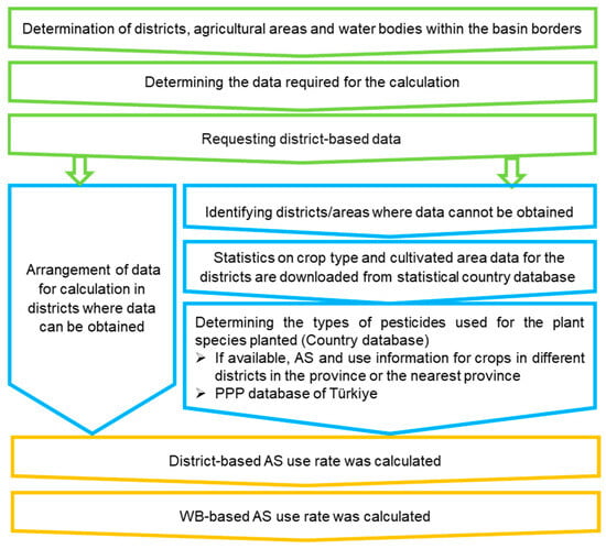 Data on pesticide use are mainly kept by the Ministry of Agriculture and relevant provincial/district directorates. However, most of these stored data relate only to pesticide groups (insecticides, herbicides, etc.) and not ASs. For this reason, the scheme given in Figure 2 was followed to determine the AS amounts used in the WBs.