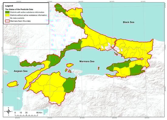 Information requested from the relevant institutions in the Marmara Basin was provided on the basis of ASs, but data were provided on the basis of pesticide groups in some districts as AS data were not kept. Figure 3 shows the pesticide data supply status on the basis of provinces and districts within the basin. As can be seen, data on ASs could only be collected for 33% of the total agricultural area of the basin.
