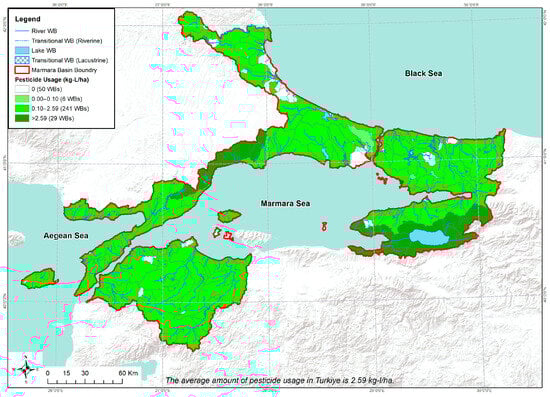 According to the results, total pesticide use in all agricultural areas within the basin is 1,043,783 kg-L/year. Calculations were performed for 276 of the 326 WBs, excluding the coastal WBs in the Marmara Basin. On an AS basis, pesticide use varied in the range of 0.04–8.83 kg/ha. The distribution of pesticide use in WBs is given in Figure 4. Average use was 1.16 kg/ha, which is below Türkiye’s average (2.59 kg/ha) given by TURKSTAT [27]. AS use exceeded this value in 32 of the WBs in the basin.
