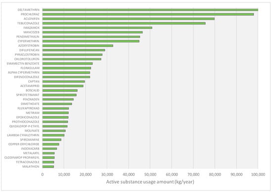 The data inventory and calculations designate that 173 types of ASs were used in all the agricultural areas of the basin. AS type and use along with CAS numbers are presented in Table S1 in the Supplementary Materials. Figure 5 addresses 36 pesticides with usage above 5 tons/year that account for 93% of the pesticide use in the basin. Accordingly, the most used pesticides in the basin are deltamethrin, prochloraz and aclonifen.
