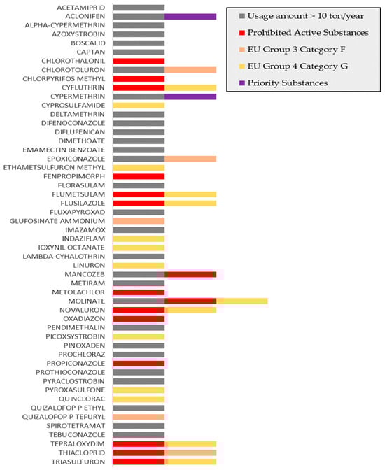 AS with high usage in the basin: Even if the ASs used in agricultural areas are not in the banned or hazardous group, when used in high amounts, they cause significant organic load in soil and water environments and negatively affect the ecological balance. Currently, the aim of the F2F strategy is to reduce the risk arising from the use of chemical pesticides, regardless of their hazardous properties [20,43]. Accordingly, ASs with a usage amount of over 10 tons/year were evaluated as a risk group for the basin. There are 29 types of ASs in the basin whose use is >10 tons/year.