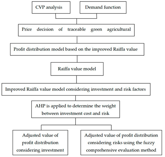 The general overview of the traceable green agricultural product pricing and profit-distribution model based on CVP analysis and the improved Raiffa value, as well as the relationships between its various parts, is shown in Figure 1.