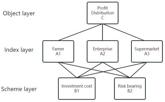 The weight vector of the adjusted value of the return distribution considering the investment cost and the adjusted value of the return distribution considering the risk is obtained via the AHP as . Then, in accordance with Formula (15), the final profit allocation of farmers, enterprises, and supermarket members is: