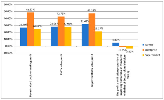 From Table 13, it can be seen that the total interests of members under centralized decision-making were RMB 1,627,220, an increase of RMB 507,220 over the total profit of members under decentralized decision-making of RMB 1,120,000, an increase of about 45.29%. Compared with the profit of members under decentralized decision-making and centralized decision-making based on the improved Raiffa value, the farmers’ profit increased by 71.46%, to RMB 214,381.85, the enterprise profit increased by 41.24%, to RMB 224,357.08, and the supermarket profit increased by 24.90%, to RMB 68,471.64. The profit of each member of the centralized decision-making is also higher than that of the decentralized decision-making, which proves the rationality and feasibility of the centralized decision-making.