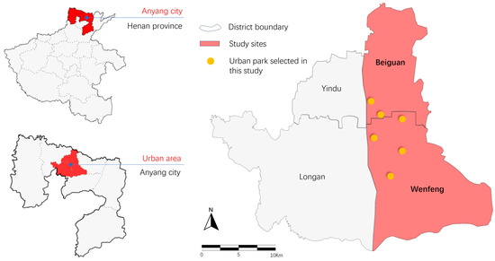 This study was conducted in Anyang city, Henan province, China. Anyang encompasses a land area of 7413 km2 and has a population of approximately 5.41 million, located in the central region of China. As a typical medium-sized city, it boasts an urbanization rate of 54.69%, aligning with the national average, as reported in the 2021 China Census. The city’s resident population includes 1.85 million individuals aged 50 and above, constituting 34.14% of the total population [70]. Compared to the sixth national census in 2010, there has been an increase of 4.95 percentage points in the proportion of those aged 50 and above, indicative of the ongoing aging of the population in Anyang. The urban area includes four administrative districts, namely Wenfeng District, Beiguan District, Longan District, and Yindu District. Wenfeng and Beiguan Districts, having the highest residential densities, were chosen as our study sites.