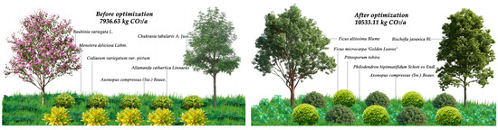 In order to assess the effect of the plants optimized by the AHP-TOPSIS model on the low-carbon construction of rain gardens in this coastal city, a rain garden in a local residential area was selected as an example of the assessment of the enhancement effect after a field visit. As shown in Figure 1 (left), the area of the rain garden in this residential area is about 60 m2, and there are 6 kinds of plants in total, including 1 Bauhinia variegata L., 1 Chukrasia tabularis A. Juss, 5 Codiaeum variegatum var. pictum, 5 Allamanda cathartica Linnaeus, and about 400 herbaceous plants, including roughly 500 Axonopus compressus (Sw.) Beauv and 80 Monstera deliciosa Liebm. According to the previous optimization results, the herbaceous plants of Axonopus compressus (Sw.) Beauv and Monstera deliciosa Liebm have high scores, but the other plants are not ranked as high in the overall score. It is assumed that all the existing plants are replaced with the best plants, and the number of plants has not changed. As shown in Figure 1(right), the total number of plant types in the rain garden after optimization is also 6, including trees such as Ficus altissima Blume and Bischofia javanica B, shrubs such as Pittosporum tobira and Ficus microcarpa ‘Golden Leaves, and herbaceous plants such as Axonopus compressus (Sw.) Beauv and Philodendron bipinnatifidum Schott ex Endl.