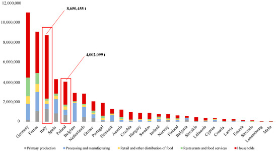 Food waste (t) per country and per supply chain stage in Europe in 2020. Source: Personal elaboration by the authors on Eurostat [4]. Data were estimated according to the different measurement methodologies suggested by the Commission Delegated Decision (EU) 2019/1597 [26], and comparability was guaranteed by reporting food waste in its fresh mass weight.