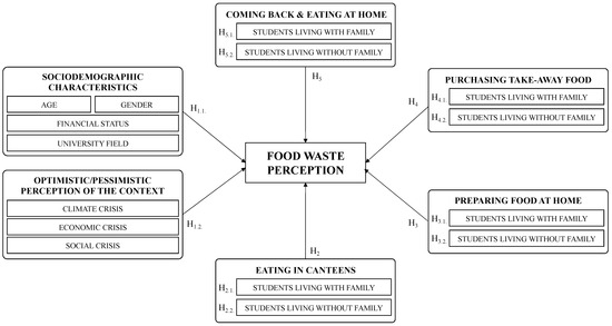 The agri-food system contributes to the worldwide greenhouse gas emissions by up to 37%, considering all stages of the supply chain, from primary production to logistic activities and consumption among final users [38]. It results that the emissions associated with agri-food activities account for about 31 Mt of CO2eq. Nowadays, one of the main challenges in the catering sector is related to the energy consumption for final use, namely the energy used for the production, the transformation and the conservation of both animal and vegetable food products, as well as the energy used for facilities and air conditioning [39,40]. However, the amount of food waste at the final consumption stage, together with the environmental impacts associated with its disposal, still represent a difficult environmental burden. It results that food waste accounts for peaks of 40% in schools and 30% in hospitals [41]. In such a light, the subsequent hypotheses were developed, so as to understand how to shape strategies and policies toward food waste minimization. Such hypotheses were developed on the basis of the overarching research question: “Do eating in canteens, preparing food at home or purchasing take-away foods influence university students’ food waste perception?”.