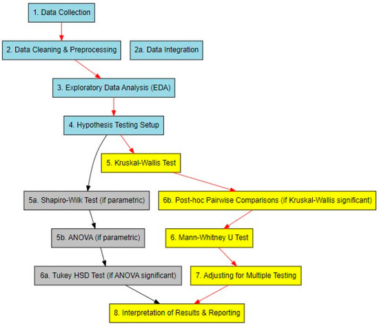 Figure 3 illustrates the research methodological workflow. The process initiates with data collection, followed by meticulous data cleaning and preprocessing. An exploratory analysis was conducted to inform the subsequent hypothesis testing setup. Due to the data not meeting parametric assumptions, as indicated by the grayed-out steps (the Shapiro–Wilk test for normality and ANOVA), the Kruskal–Wallis test was employed to assess differences across multiple groups. Significant findings from this test lead directly to post hoc pairwise comparisons using the Mann–Whitney U test. Steps involving parametric tests (Shapiro–Wilk, ANOVA, and Tukey HSD) were omitted, which is justified by the non-parametric nature of the data. The analysis concluded with Adjusting for Multiple Testing to ensure the robustness of the findings, followed by the Interpretation of Results & Reporting, where results were synthesized and contextualized within the research narrative.