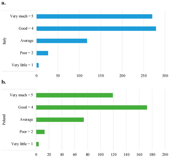 Food waste awareness in Italy (a) and Poland (b). Note: Participants were asked to respond to the question “How aware are you of the problem of food waste?” and could answer according to a five-point Likert scale. Source: Personal elaboration by the authors.