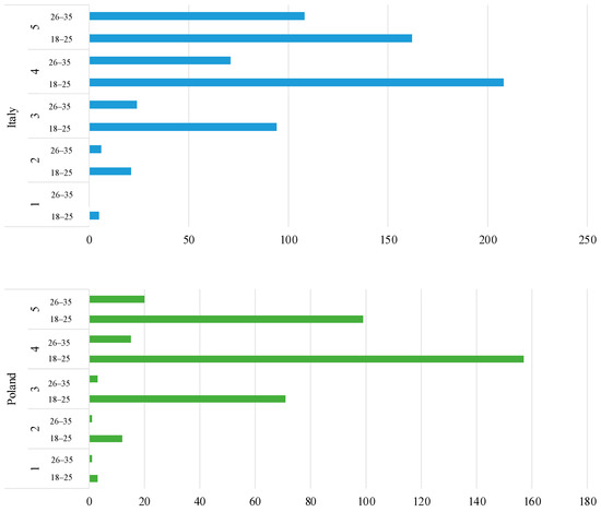 In both Italy and Poland, age proved to be a pivotal factor. The Italian sample, in utilizing the Mann–Whitney U test, revealed significant differences in food waste perception across various age groups (p = 0.00000272). This trend was also evident in the Polish data, where age-related perceptual differences were significant (p = 0.0079), suggesting a generational gap in awareness and attitudes toward food waste. Figure 5 illustrates food waste awareness vs. age group in Italy and in Poland.