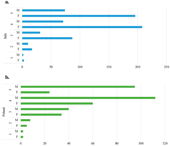 Food waste awareness vs. sex in Italy (a) and in Poland (b) according to H1.1. Note: 1 = very little; 2 = poor; 3 = average; 4 = good; 5 = very much aware of food waste. Source: Personal elaboration by the authors.
