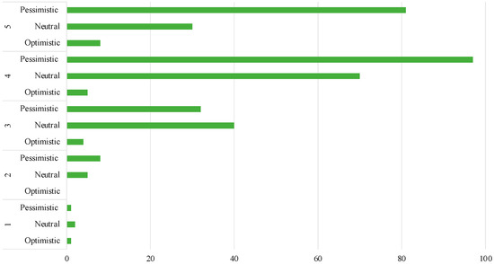 In addition, consumers are influenced by significant experiences with food scarcity and food insecurity, such as wars, conflicts and epidemics. Specifically, Szabó-Bódi et al. [35] estimated that people experiencing wars, such as those who lived through World War II, tend to waste less compared to those who have never experienced such tragic events, especially in Europe [29]. In addition, it has been evaluated that, during the COVID-19 pandemic, people wasted less amounts of food compared to the period soon before the pandemic [7]. Such reductions should be read in the light of the increases in inflation and in the cost of raw materials, and therefore also of basic food, as revealed by global markets [36]. The second hypothesis investigates the effects that optimistic or pessimistic feelings on the socio-economic and environmental context have on food waste perception among university students.