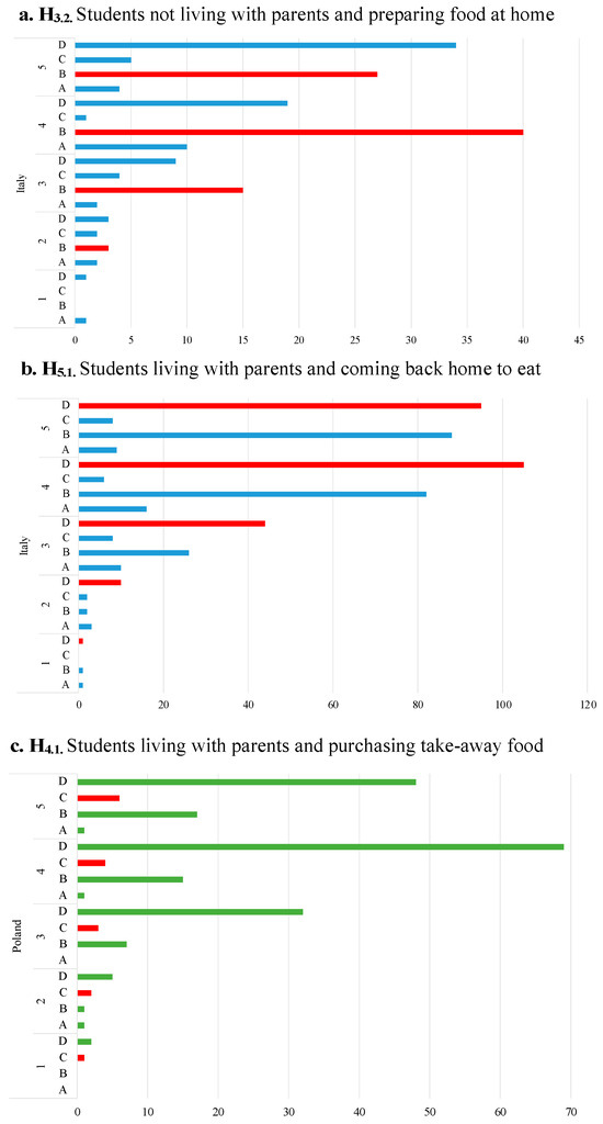Food waste awareness vs. living arrangements and dietary practice according to H3.2. (a) and H5.1. (b) in Italy and H4.1. (c) in Poland. Note: A = eating in canteens; B = preparing food for lunch at home; C = buying take-away food and eating in public areas; D = going back home to have lunch. Red lines indicate the living arrangement objects of the hypothesis; 1 = very little; 2 = poor; 3 = average; 4 = good; 5 = very much aware of food waste. Red lines identify the significant values. Source: Personal elaboration by the authors.