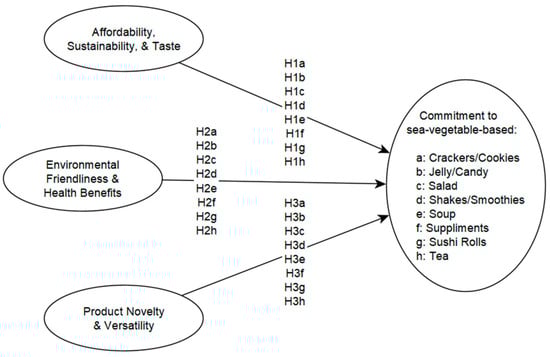 The recent body of work in the literature emphasizes sea-vegetable product attributes such as affordability, sustainability, and taste as essential to product commitment [17,25,26]. In terms of affordability, Young et al. (2022) discussed how product accessibility and an affordable price point are the greatest enablers for sea-vegetable purchase and consumption by Australian consumers [17]. Earlier studies indicated that US consumers rate seaweed lower in taste when compared to traditional seafood [27,28,29]. However, it needs to be acknowledged that the sea-vegetable taste depends on the species used and may even vary with differences in preparation and processing methods [30]. In addition, paying a premium price for sea-vegetables is not appreciated by US consumers [29]. Regarding affordability, an Italian study presented similar findings. Italian consumers were not willing to purchase at a high price point [19]. Sea-vegetables as a food source are viewed as more sustainable compared to animal-based protein sources, as the production and processing of seaweed are not as strongly associated with environmental degradation and negative externalities as agricultural production and animal husbandry [7,27]. In addition, various studies emphasize that, particularly in food processing, e.g., obtaining the functional compounds of seaweed, a shift from conventional towards sustainable seaweed extraction methods has occurred [27]. Smart technologies and eco-friendly solvents, such as ionic liquids or solvents produced from biomass, lead the way to more sustainable extraction processes. In contrast to conventional extraction processes, the sustainable extraction process requires less energy and does not produce large quantities of hazardous chemical waste [27]. Amidst this background, the following hypotheses are proposed: