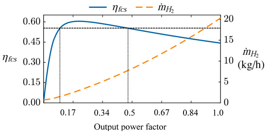 The fuel cell delivers power with a variable efficiency, depending on the power rate, as shown in Figure 1.
