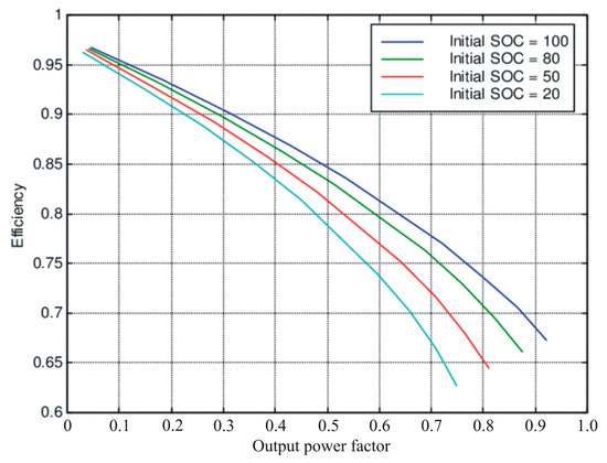 The lithium battery discharge efficiency evolves with the output power factor, depending on the state of charge, as represented in Figure 2.