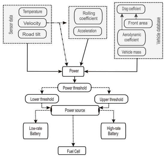 The control system collects data from the vehicle database and sensors, determines the dynamic force parameters, and calculates the power demand; then, it compares the obtained value to the lower and higher threshold setup and engages the corresponding power source, the low-rate battery if the power demand is below the lower threshold, the high-rate battery if it is above the upper threshold, and the fuel cell if the power requirement is between these thresholds.