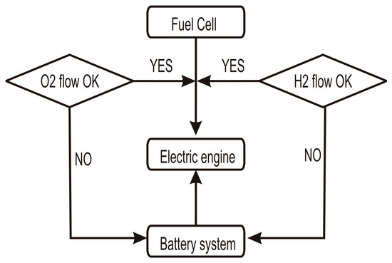 If the air flow is stopped or diminished below the minimum required to maintain the fuel cell’s operation, the fuel cell does not continue working and the system commutes to battery power source; this situation reduces the driving range of the vehicle and requires servicing. The flowchart in Figure 4 shows the control system operation.