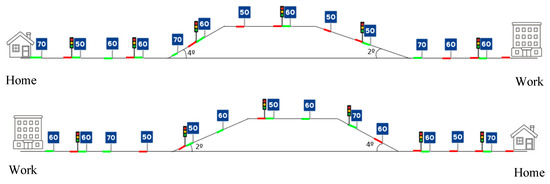 The green, red, and gray segments in Figure 6 represent the acceleration, deceleration, and constant velocity processes. We consider an urban standard round-trip route for a total driving time of 20 min and a travelling distance of 20 km each way.