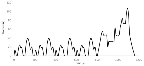 Applying driving conditions to the round-trip route shown in Figure 3, we obtain the evolution of the power demand (Figure 7) [21].