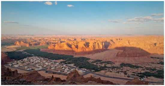 Six nature reserves with a total area of about 13,000 km2 have been created in AlUla [75] to conserve the biodiversity and natural heritage of the place. Currently, more than 50% of the territory of AlUla is a protected area, and the authorities aim to increase this percentage to 80%. The development masterplan for AlUla, titled “Journey Through Time”, has designated five districts that succeed one another through the AlUla oasis, leading on a journey through time by progressively approaching the Hegra site. In addition to delineating archaeological sites requiring protection and districts characterized by new study centers, significant importance has been given to the “rejuvenated oasis”.
