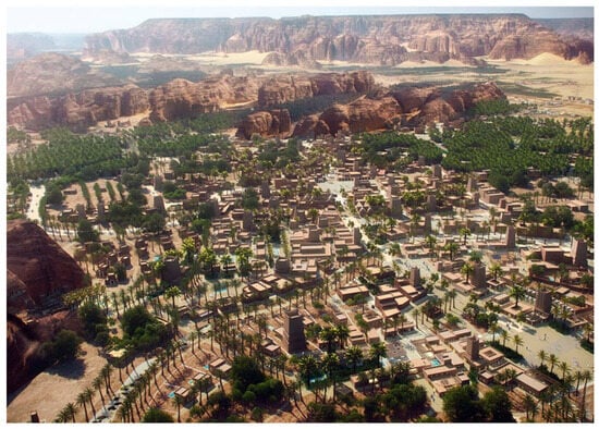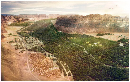 Rendering of AlUla’s oasis from Journey Through Time Master Plan (source: https://ucl.rcu.gov.sa/en, accessed on 25 January 2024).