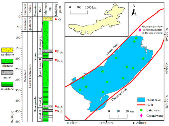 The bottom-up strata in the northern shore of Hulun Lake mainly include Cambrian strata (ϵ); Paleozoic Carboniferous−Permian metamorphic strata (C3−P1); Upper Cretaceous Xinganling strata (K1s); Cretaceous Damoguaihe Formation strata (K1d); Cretaceous Yimin Formation strata (K1y); and Quaternary strata (Q). The stratigraphic data and hydrogeological data within a 500 m depth of the Jalainur Depression Zone on the northern side of Hulun Lake, revealed by exploration, show that the aquifers include (Figure 1) a Quaternary aquifer (Q) with a buried depth of 39 m; the Lower Cretaceous–Yimin Formation Coal Group I aquifer (K1y1) with a roof burial depth of 158 m and aquifer thickness of 11.4 m; the Lower Cretaceous–Yimin Formation Coal Group II aquifer (K1y2) with a roof burial depth of 200 m; the Lower Cretaceous–Damoguaihe Formation Coal Group I aquifer (K1d1) with a roof burial depth of 420 m and aquifer thickness of 3~6 m; and the Lower Cretaceous–Damoguaihe Formation Coal Group II aquifer (K1d2) with a roof burial depth of 441 m and aquifer thickness of 8 m.